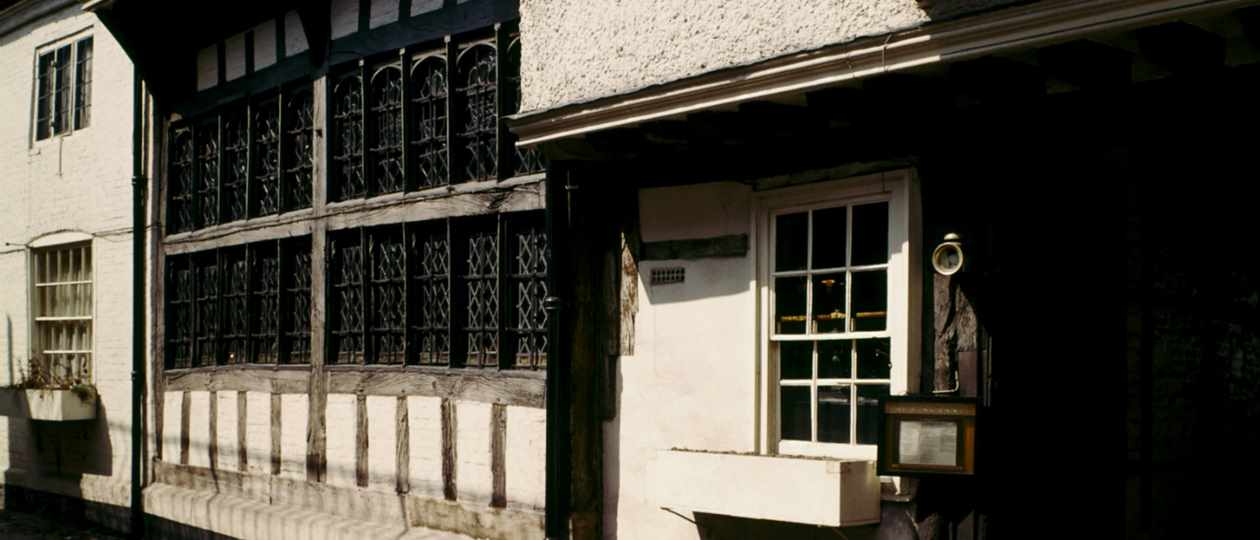 Dating back to 1455, the building has many fascinating architectural features, including rare stained-glass windows, exposed wattle and daub and the original stabling for the inn.